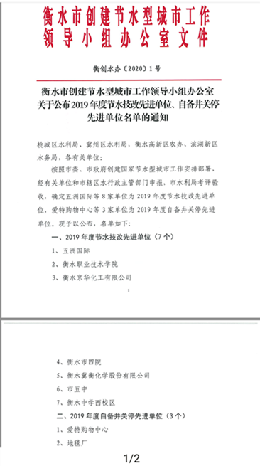 近日,我公司被衡水市創(chuàng)建節(jié)水型城市工作領(lǐng)導(dǎo)小組評(píng)為2019年度節(jié)水技改先進(jìn)單位。
