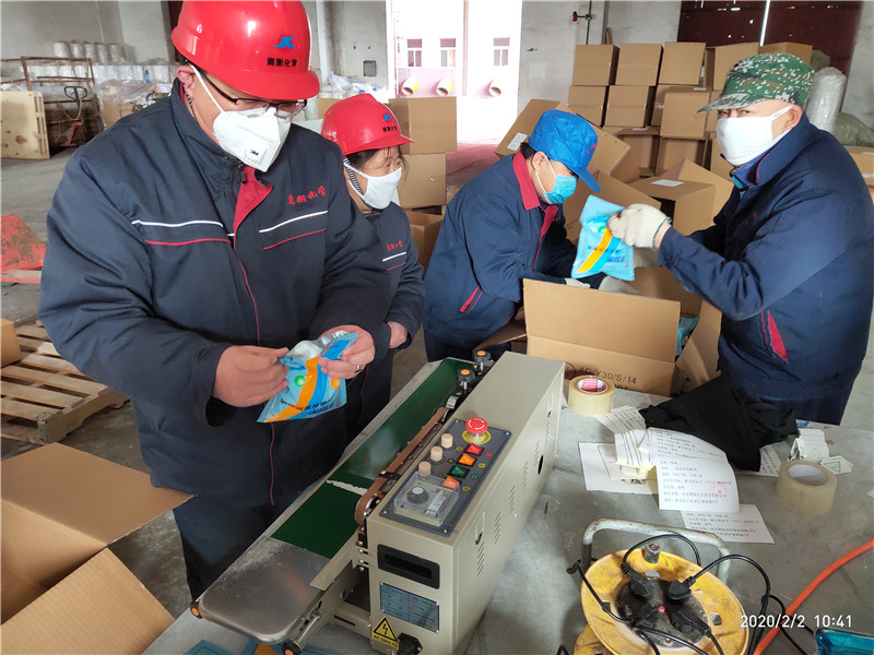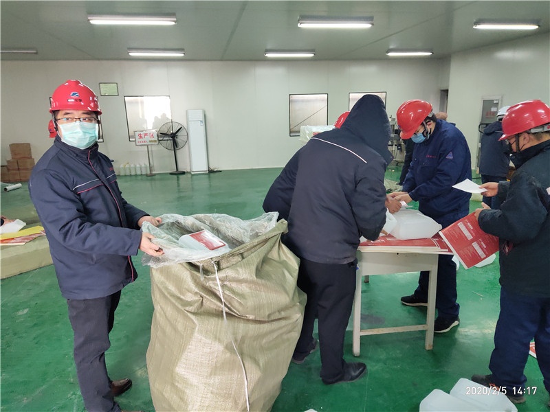 疫情爆發(fā)以來,冀衡化學(xué)公司充分發(fā)揮黨組織戰(zhàn)斗堡壘作用和黨員先鋒模范作用,全面部署、迅速行動、周密安排,嚴(yán)密防控,全體黨員在崗在位,黨員干部沖鋒在前,以黨建引領(lǐng),堅(jiān)決打贏新冠肺炎疫情防控阻擊戰(zhàn),在做好公司防控工作的同時(shí),公司全體黨員自愿組成黨員突擊隊(duì),加班加點(diǎn)不計(jì)報(bào)酬,義務(wù)勞動灌裝消毒液產(chǎn)品,倒裝消毒顆粒產(chǎn)品,協(xié)助政府打好防控消毒戰(zhàn)!